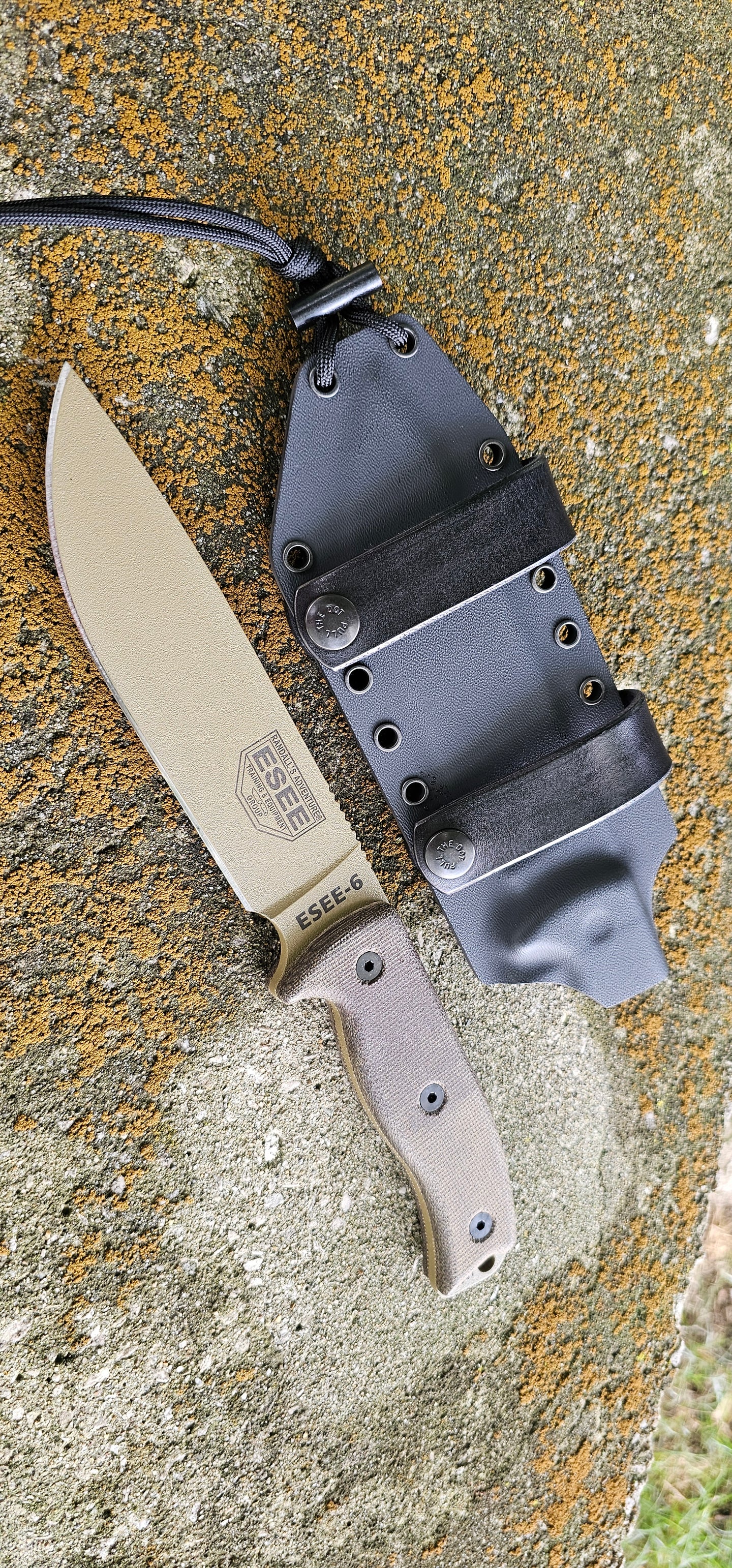 ESEE ESEE-6 Custom Kydex Sheath, Scout Carry, IWB Straps, Mini Firesteel Rod, 550 Mil-Spec Paracord, Pancake