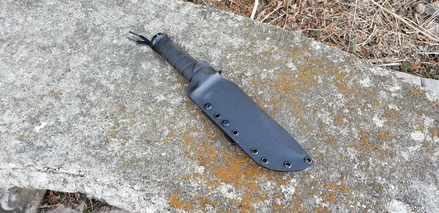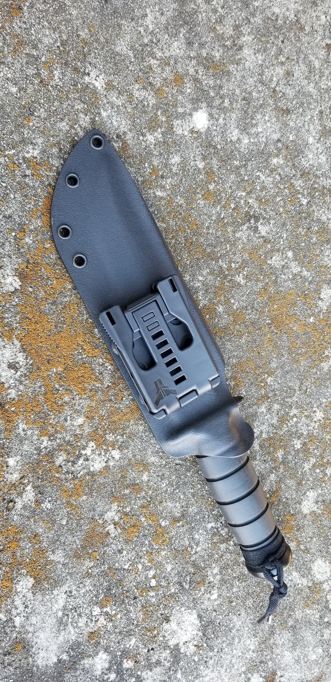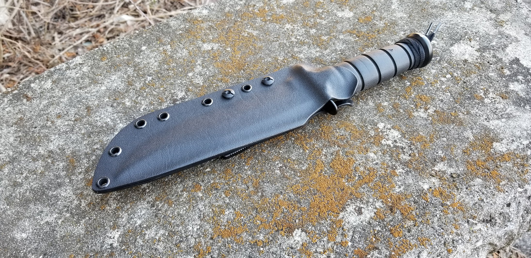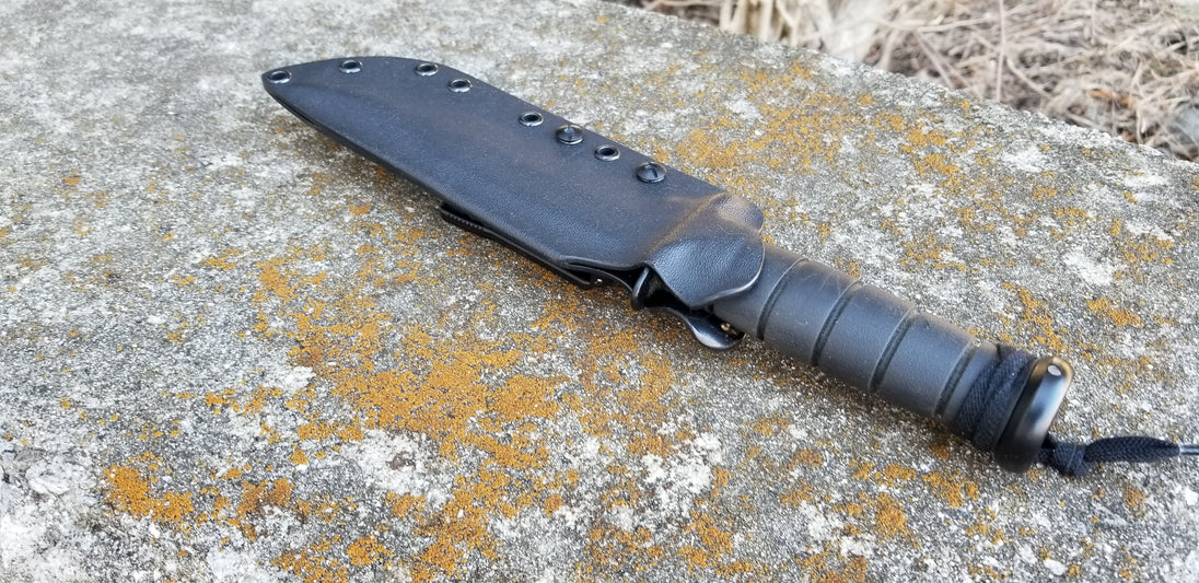 This sheath is custom designed for the KA-BAR USMC knife and the KA-BAR FULL SIZE FIGHTING KNIFE. This sheath will fit Both , including serrated blade. Shown in Black Kydex, pancake style.