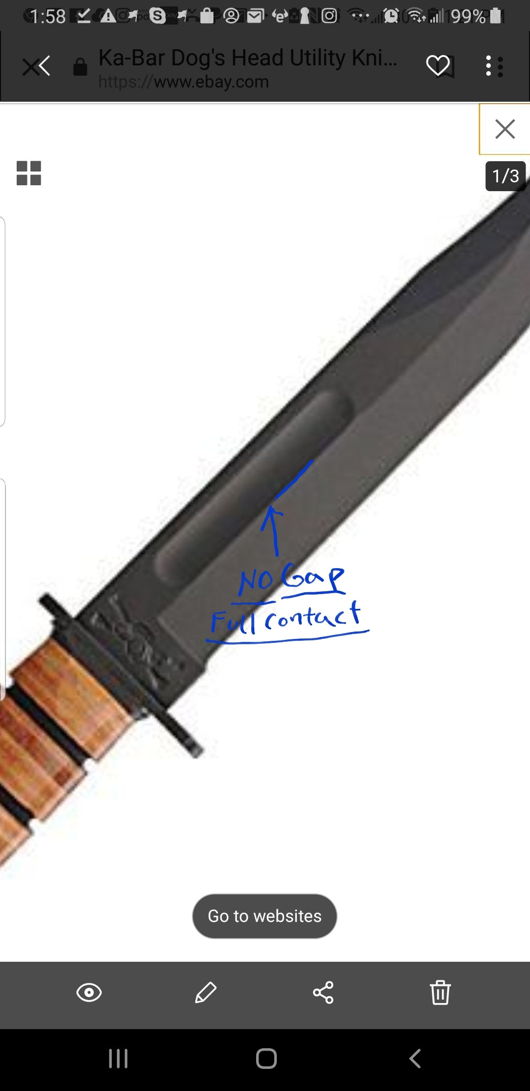 ::::::PLEASE NOTE:::::: >>>>>>(((((((The Ka-Bar full size fighting knife and USMC knife must have the fuller groove (blood groove) touching (fully contacting) the primary Bevel. There are two generations of this knife. One with Bevel touching the blood groove and the other generation with a small 2mm-3mm space between the blood groove and the primary bevel.))))) The blade that has the blood groove touching the Primary Bevel is the original WWII Grind. The blade MUST be the WWII Grind. IF YOU ARE NOT SURE, PLEASE CONTACT ME!! (IF YOUR KNIFE DOES HAVE A SPACE BETWEEN THE BEVEL AND BLOOD GROOVE, CONTACT ME, I CARRY THE OTHER VERSION AS WELL. YOU NEED TO CONFIRM THAT WITH ME. THE TWO STYLES WILL NOT INTERCHANGE AND WILL NOT FIT. I MUST USE THE CORRECT BLADE TYPE!!) You can still place the order , just send me an email with name and order number and I will make note to use the proper knife in the build process. If you have the WWII version, no need to contact me. I will process the order as listed.