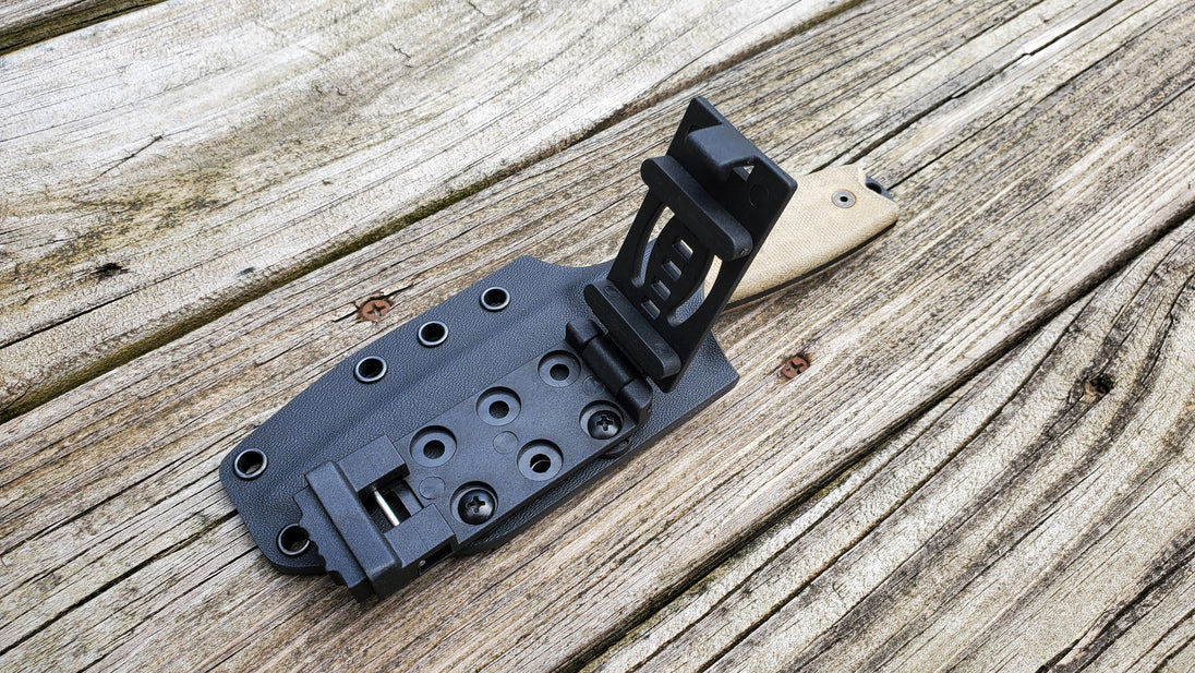 This sheath will accept any attachment that has the 3/4" hole spacing. Which include Tek-lok, Molle-Lok, the latest D.O.T.S. Belt Clips (similar to blade-tech Tek-Lok), Malice clips, ect.....or any of my universal custom Kydex belt attachments such as belt loops, Clips, Danglers and More.