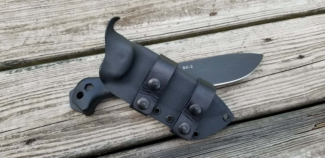 KA-BAR BK2 Scout Carry custom Taco style kydex sheath w/ pair of double snap leather scout carry belt attach.