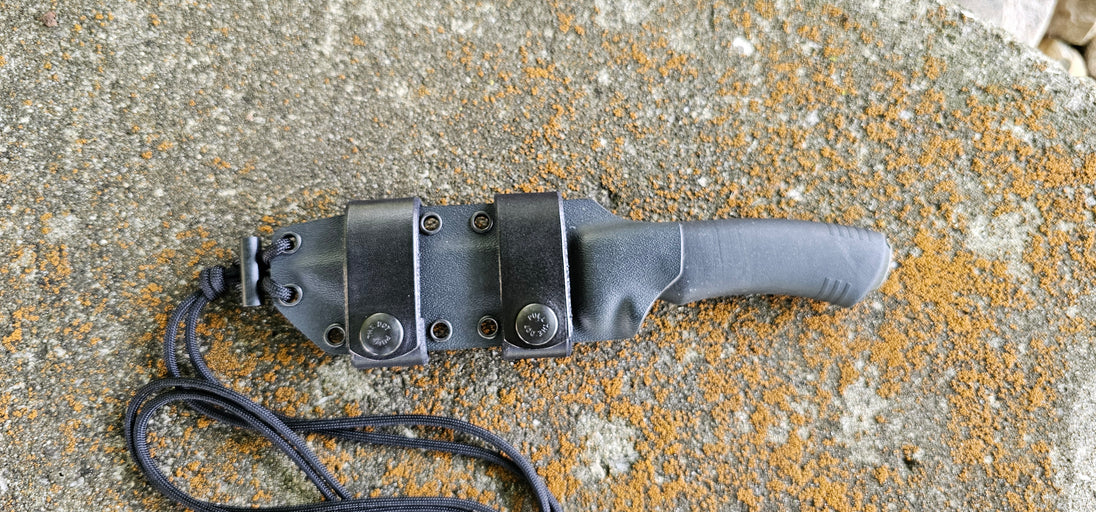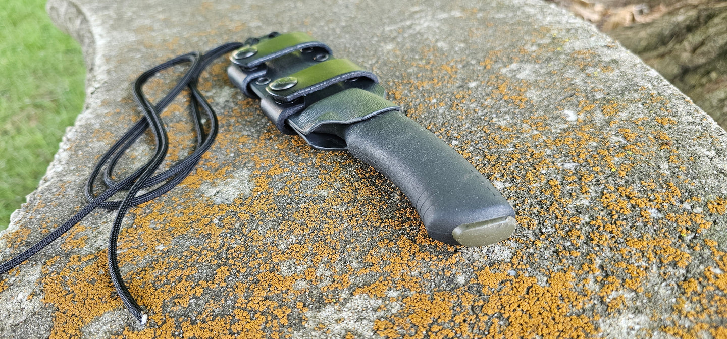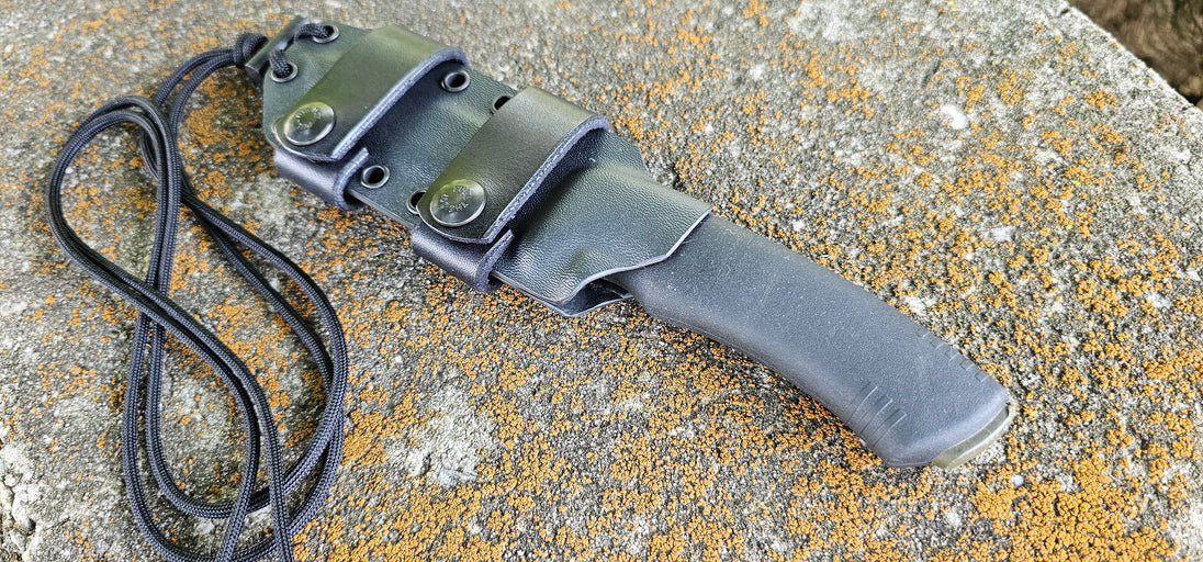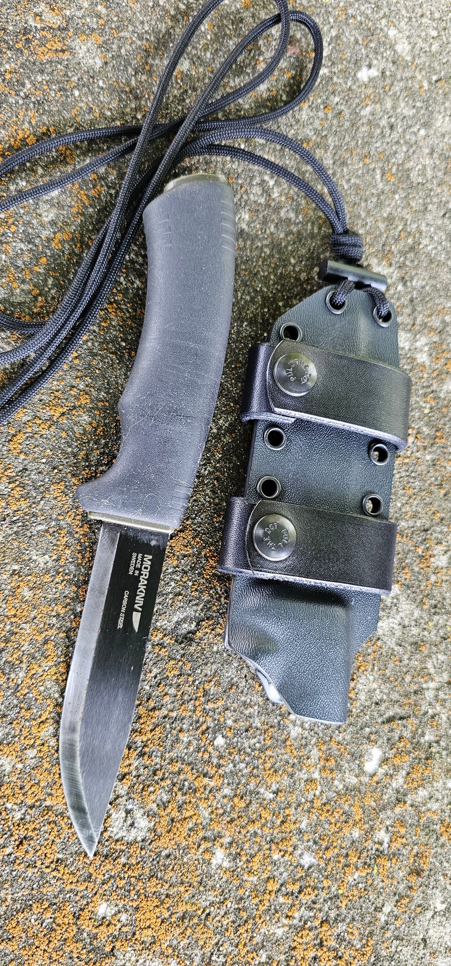 MORA "BUSHCRAFT" custom kydex sheath, Neck & Scout Carry, Leather Scout Straps, Paracord Lanyard, Mini Firesteel rod, Pancake.