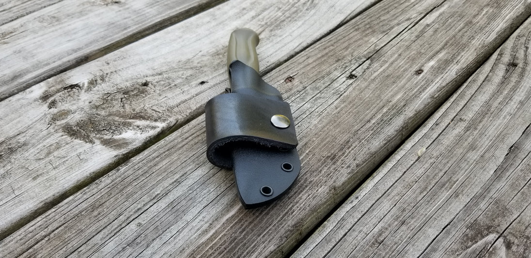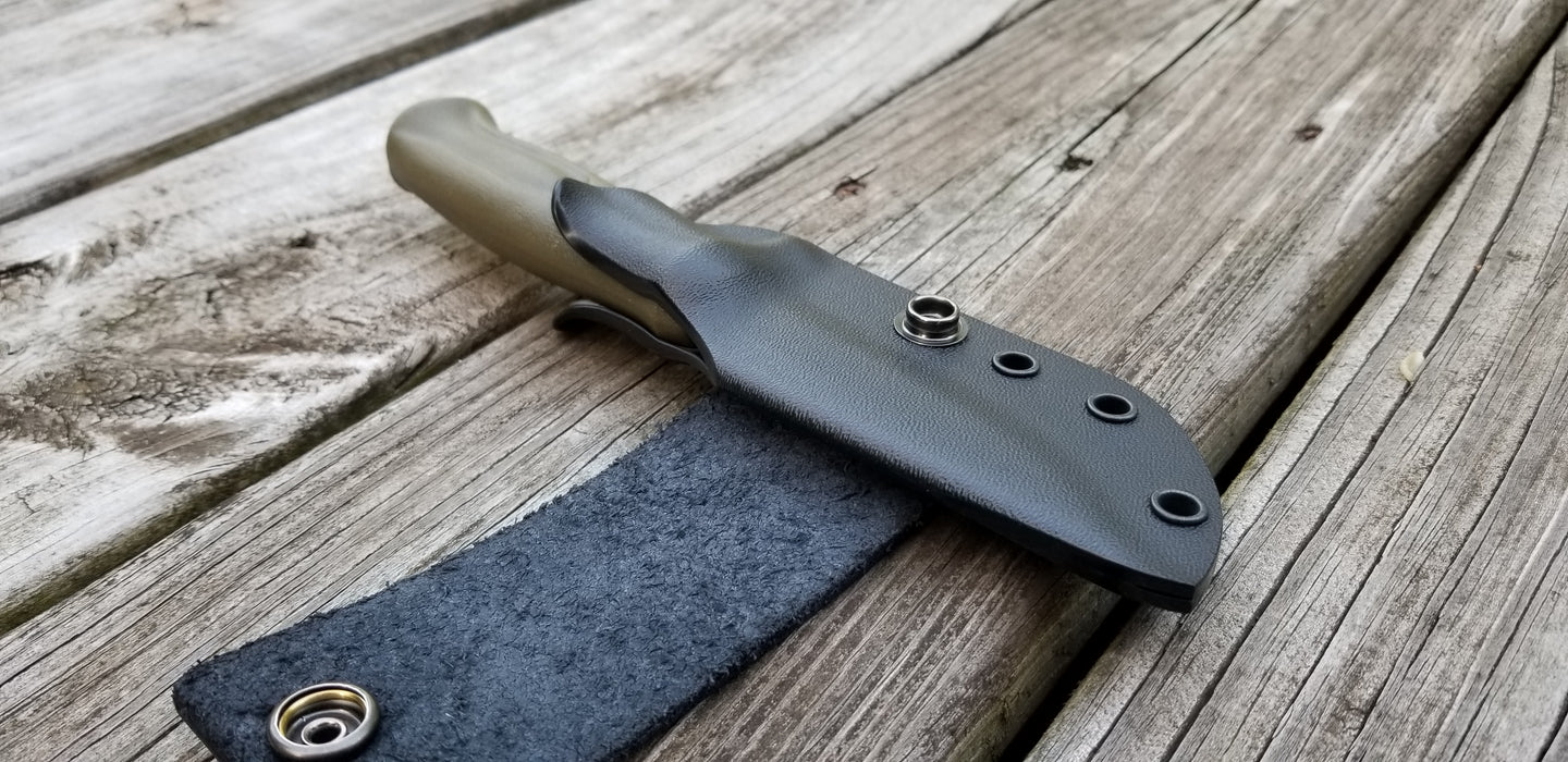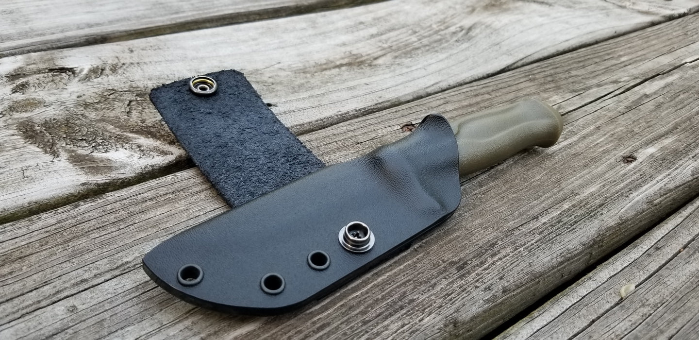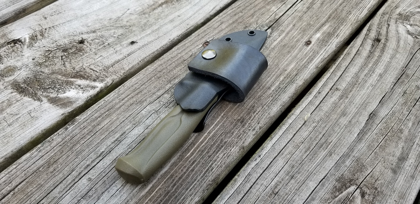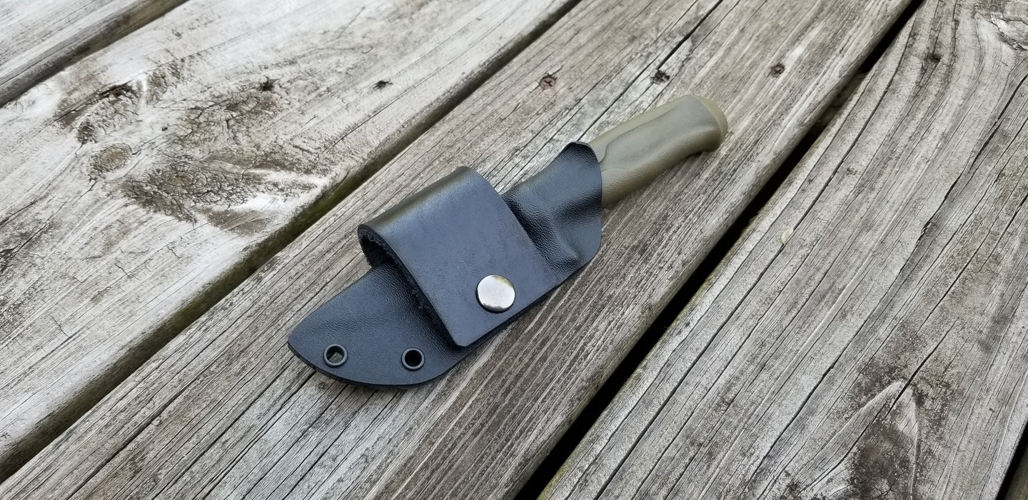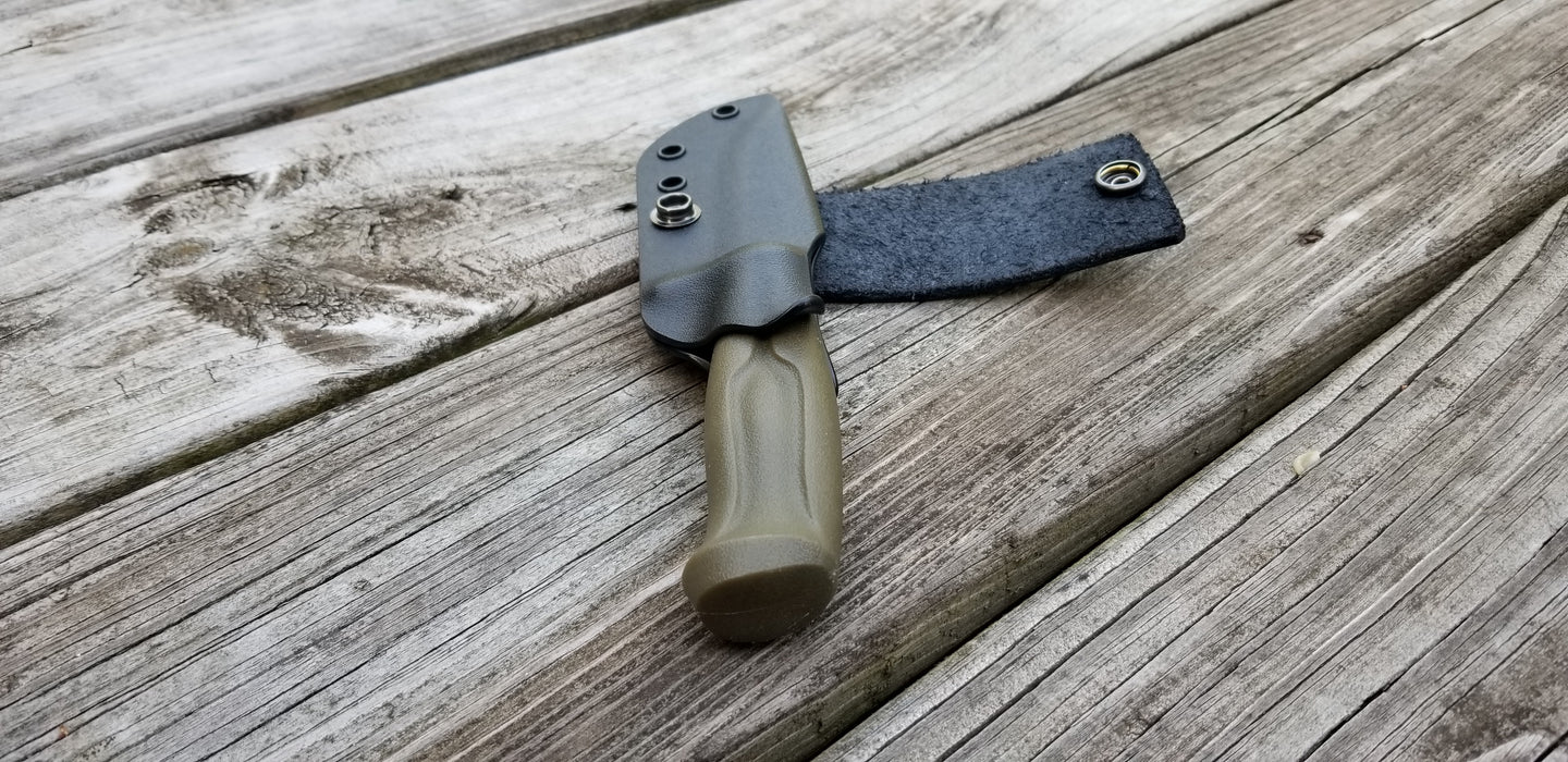 This is a Custom Kydex Sheath for the MORA CRAFTLINE Q 511 with leather scout style loop.