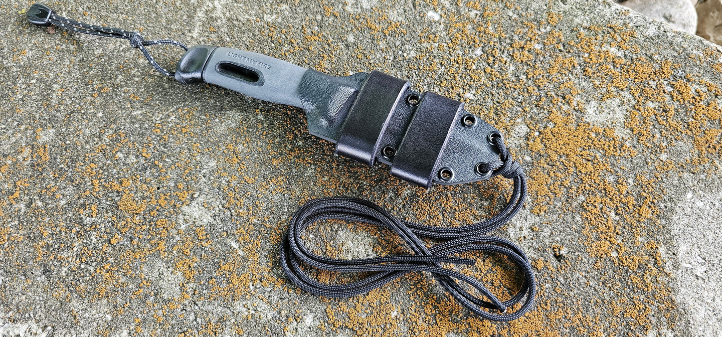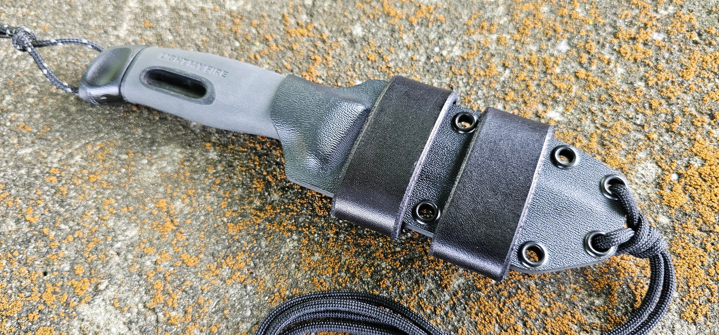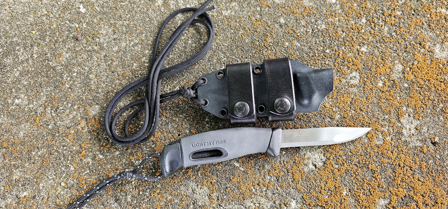 MORA "Light My Fire" custom kydex sheath, Neck & Scout Carry, Leather Scout Straps, Paracord Lanyard, Pancake.