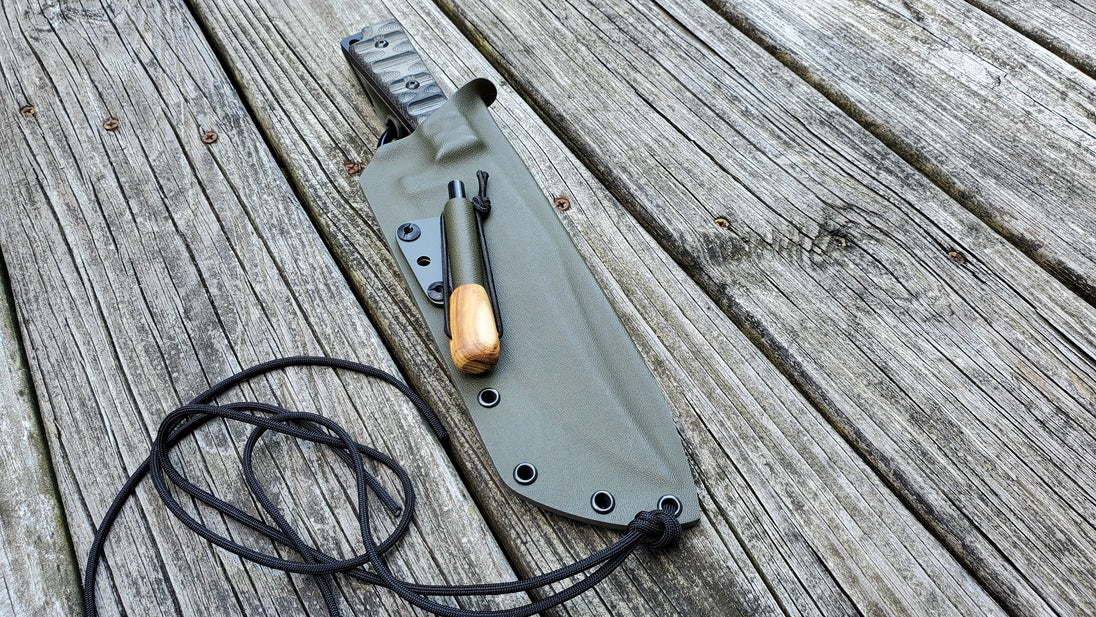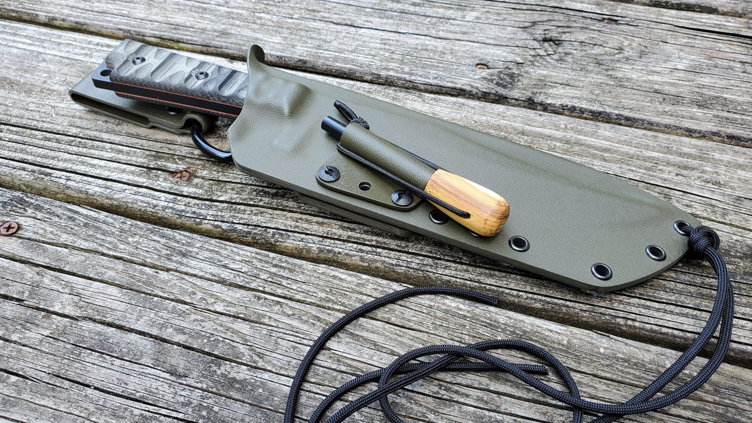 TACO STYLE KYDEX SHEATH with a DANGLER, FIRESTEEL HOLDER and approximately 5' of 550 PARACORD LANYARD
