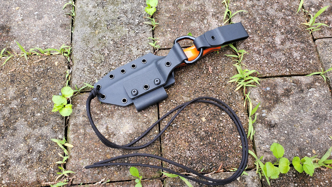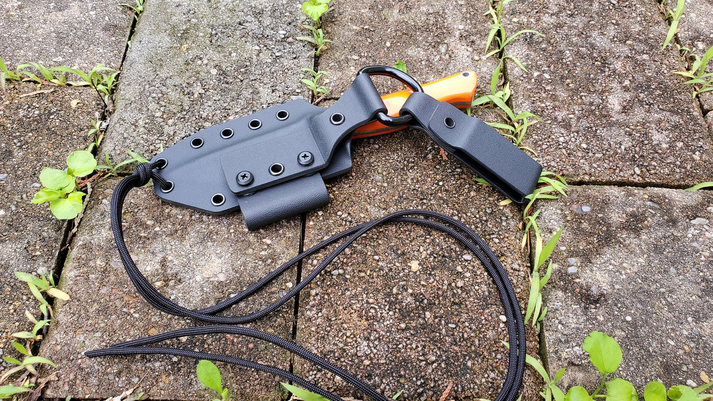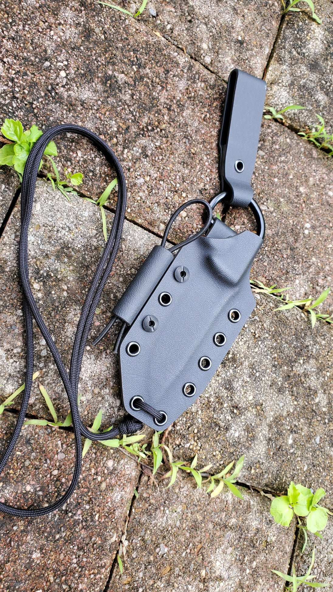 Kydex dangler made of kydex mounting plate , Heavy wire D-Ring and Kydex belt loop fastened to the sheath with high grade machined black oxide steel Chicago screws.
