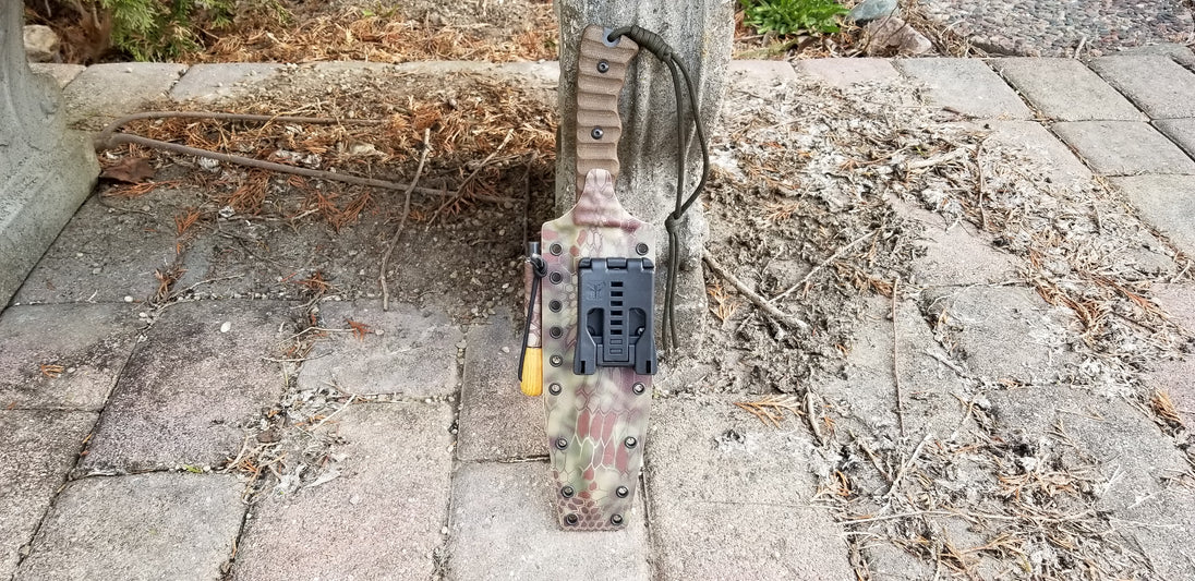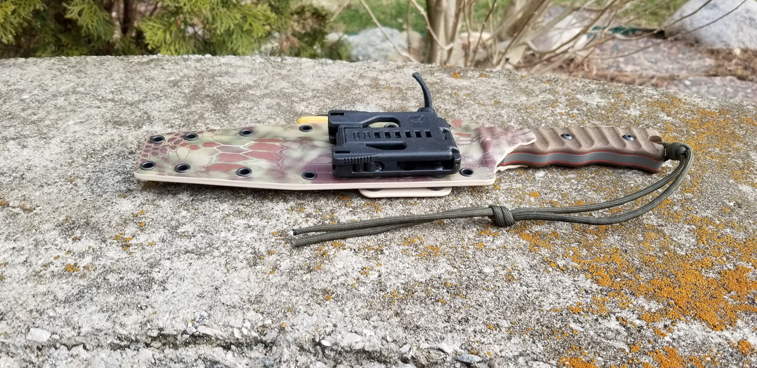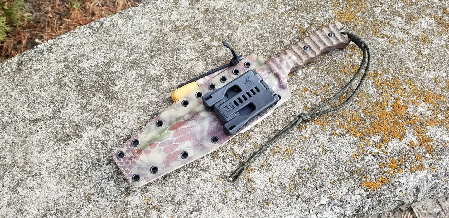 Pancake kydex sheath with Tek-Lok style belt attachment, and a wide firesteel Holder ready for a pouch . (Pictures shows rig in Kryptek Highlander for the color) color choice is yours, choose from the colors available in the menu.